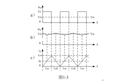 圖1-3、圖1-4、圖1-5分別是控製開關K的占空比D等於0.5、< 0.5、> 0.5時,圖1-2電路中幾個關鍵點的電壓和電流波形。圖1-3-a)、圖1-4-a)、圖1-5-a)分別為控製開關K輸出電壓uo的波形;圖1-3-b)、圖1-4-b)、圖1-5-b)分別為儲能濾波電容兩端電壓uc的波形;圖1-3-c)、圖1-4-c)、圖1-5-c)分別為流過儲能電感L電流iL的波形。