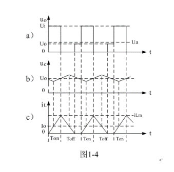 (2)當Ui > 2Uo時,即:濾波輸出電壓Uo小於電源輸入電壓Ui的一半時,或控製開關K的占空比小於二分之一時:雖然在K接通期間,流過儲能電感L的電流上升率(絕對值),大於,在K關斷期間,流過儲能電感L的電流上升率(絕對值);但由於(1-5)式中i(0)等於0,以及Ton小於Toff,此時,(1-11)式中的iLX會出現負值,即輸出電壓反過來要對電感充電,但由於整流二極管D的存在,這是不可能的,這表示流過儲能電感L的電流提前過0,即有斷流。在這種情況下,流過儲能電感L的電流iL不是連續電流,開關電源工作於電流不連續狀態,因此,輸出電壓Uo的紋波比較大,且濾波輸出電壓Uo小於濾波輸入電壓uo的平均值Ua。參看圖1-4。