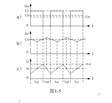 (3)當Ui < 2Uo時,即:濾波輸出電壓Uo大於電源輸入電壓Ui的一半時,或控製開關K的占空比大於二分之一時:在K接通期間,雖然流過儲能電感L的電流上升率(絕對值),小於,在K關斷期間,流過儲能電感L的電流上升率(絕對值)。但由於Ton大於Toff,(1-5)式中i(0)和(1-11)式中iLX均大於0,即:電感存儲能量每次均釋放不完。在這種情況下,流過儲能電感L的電流iL是連續電流,開關電源工作於連續電流狀態,輸出電壓Uo的紋波比較小,且濾波輸出電壓Uo大於濾波輸入電壓uo的平均值Ua。參看圖1-5。
