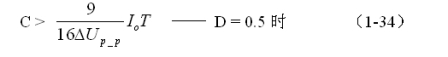 (1-33)和(1-34)式,就是計算反轉式串聯開關電源儲能濾波電容的公式(D = 0.5時)。式中:Io是流過負載電流的平均值,T為開關工作周期,ΔUP-P為濾波輸出電壓的波紋,或電壓紋波。一般波紋電壓都是取電壓增量的峰-峰值,因此,當D = 0.5時,波紋電壓等於電容器充電的電壓增量,即:ΔUP-P = 2ΔUc 。