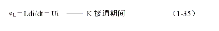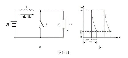 式中Ton為控製開關K接通的時間。當圖1-11-a中的控製開關K由接通狀態突然轉為關斷時,儲能電感L會把其存儲的能量(磁能)通過反電動勢進行釋放,儲能電感L產生的反電動勢為: