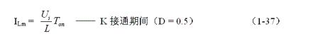 式中Io為流過負載的電流,當D = 0.5時,其大小等於最大電流iLm的四分之一;T為開關電源的工作周期,T正好等於2倍Ton。