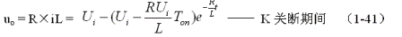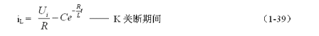 式中C為常數,把初始條件代入上式,就很容易求出C,由於控製開關K由接通狀態突然轉為關斷時,流過儲能電感L中的電流iL不能突變,因此,i(Ton+)正好等於流過儲能電感L的最大電流ILm ,所以(1-39)式可以寫為: