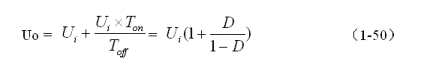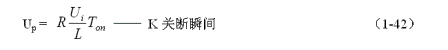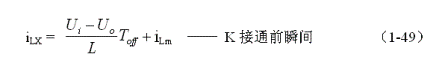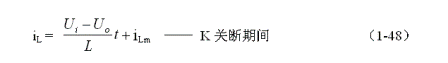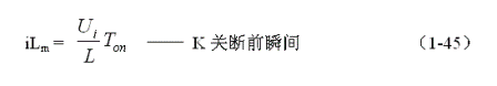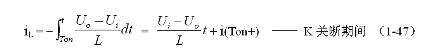 式中i(Ton+)為控製開關K從Ton轉換到Toff的瞬間之前流過電感的電流,i(Ton+)也可以寫為i(Toff-),即:控製開關K關斷或接通瞬間,之前和之後流過電感L的電流相等。實際上(1-47)式中的i(Ton+)就是(1-45)式中的iLm,因此,(1-9)式可以改寫為: