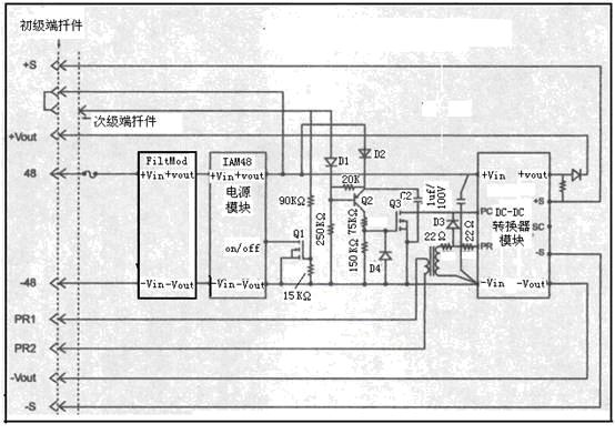 當48V母線關斷時,母線上的保持電容可通過並聯開關迅速放電。除了通斷控製功能外,IAM48模塊還具有限製浪捅電流的功能,並且與FiltMod模塊或EMI濾波器模塊配合,還可完成瞬變過電壓保護.通信設備中為了滿足EMC{電磁兼容)標準,通常都采用IAM48和FitMod模塊(見圖1中FitMod模塊與IAM48模塊的連接)。在通信設備中,都要求電源模塊具有熱插拔功能,因此應選用lAM48電源模塊或其他可限製浪湧電流的模塊。
