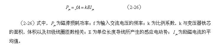 (2-25)式中,A為一個周期內變壓器鐵芯的磁滯損耗,單位是焦耳;E為單位長度導線所產生的感應電動勢,單位為伏; 為勵磁電流的平均值,單位為安培;T為輸入交流電壓的周期,單位為秒,f為脈衝頻率,或開關電源的工作頻率,單位為赫芝;k為比例係數,它是一個與選用單位製和變壓器鐵芯麵積、體積以及初級線圈匝數等參數相關的常量。在(2-21)、(2-22)、(2-23)、(2-24)式中,沒有比例係數k,是為了使問題簡單,便於分析。