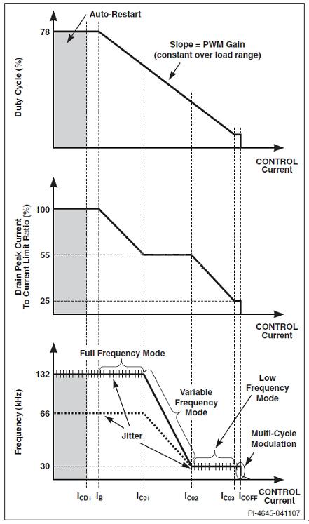 隨著輸出負載的降低,TOPSwitch-HX控製將切換至變頻模式(VFM)。在此模式下,功率MOSFET峰值漏極電流將保持不變,同時開關頻率會從132kHz的初始全頻(或66kHz,取決於用戶的選擇)下降到30kHz。占zhan空kong比bi隨sui著zhe負fu載zai的de降jiang低di而er減jian小xiao,這zhe一yi過guo程cheng通tong過guo延yan長chang開kai關guan脈mai衝chong之zhi間jian的de關guan斷duan時shi間jian來lai完wan成cheng。開kai關guan頻pin率lv的de降jiang低di導dao致zhi開kai關guan損sun耗hao下xia降jiang,並bing可ke在zai負fu載zai降jiang低di時shi維wei持chi電dian源yuan效xiao率lv恒heng定ding不bu變bian。