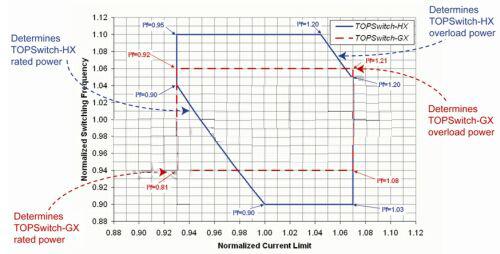在圖3中,對TOPSwitch-HX與上一代的TOPSwitch-GX(無I2f調整)的工作區域進行了比較。去除特性曲線的左下方區域(I2f=0.81),TOPSwitch-HX可確保在最差情況下提高通過變壓器傳導的最小能量。這樣,使用一個初級繞組電感低於先前要求的大約9%的變壓器,即足以在最差情況下提供指定的輸出電流。