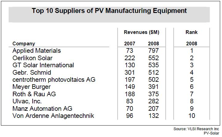 VLSI Research的數據顯示,Applied Materials全年晶體矽太陽能設備和薄膜太陽能設備收入總和達到了7.97億美元,超過了排在第二位的Oerlikon Solar,該公司收入額為5.52億美元。