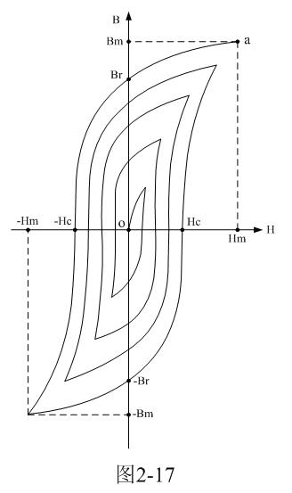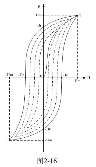 磁矯頑力的大小反映鐵磁材料保持剩磁狀態的能力。圖2-16表明,當磁場按Hm→0→-Hc→-Hm→0→Hc→Hm次序變化時,B所經曆的相應變化為Bm→Br→0→-Bm→-Br→0→Bm。於是得到一條閉合的B~H曲線,稱為磁滯回線。所以,當鐵磁材料處於交變磁場中時(如變壓器中的鐵芯),它將沿磁滯回線反複被磁化→去磁→反向磁化→反向去磁,這個過程周而複始。