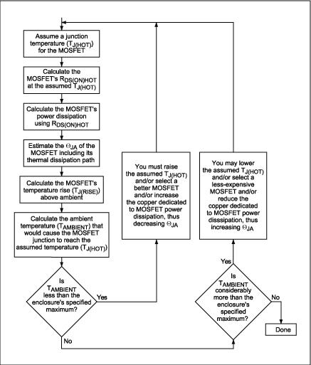 圖1.該流程圖展示了選擇各MOSFET(同步整流器和開關MOSFET)的迭代過程。在這個過程中,各MOSFET的結溫為假設值,兩個MOSFET的功率耗散和允許環境溫度通過計算得出。當允許的環境溫度達到或略高於我們所期望的機箱內最高溫度時(機箱內安裝了電源及其所驅動的電路),這個過程就結束了。[page]