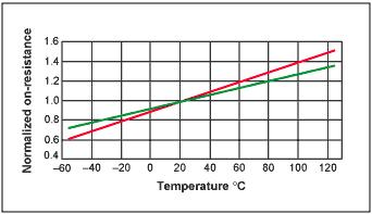 圖2.典型功率MOSFET的導通電阻的溫度係數在0.35%每度(綠線)至0.5%每度(紅線)之間