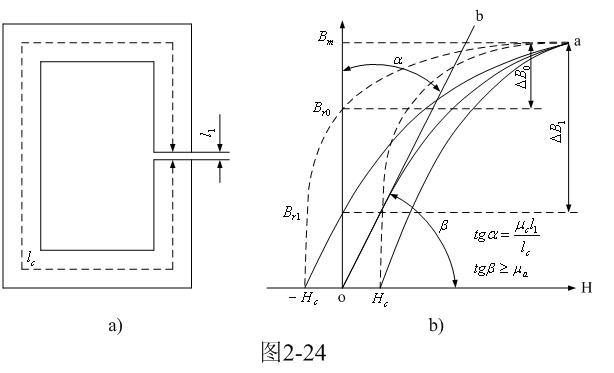 如圖2-24所示是留有氣隙的變壓器鐵芯的工作原理圖與磁化曲線圖 。