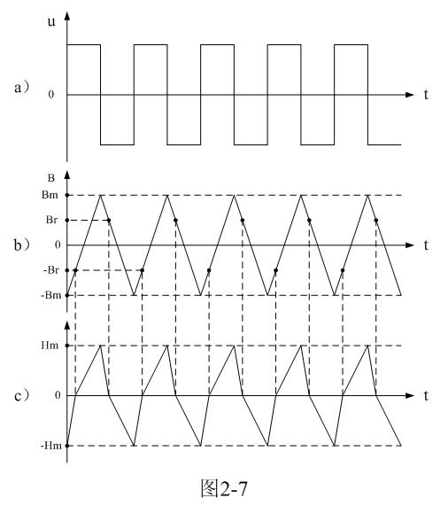 在正常情況下,當有交流脈衝電壓輸入時,磁通密度B就會沿著理想磁化曲線d-a,由負最大值-Bm至正最大值Bm,然後,又由正最大值Bm至負最大值-Bm,來回地變化;對應磁場強度H也是沿著理想磁化曲線d-a由負最大值-Hm至正最大值Hm,然後,又由正最大值Hm至負最大值-Hm,來回變化。