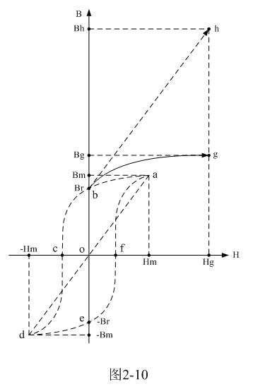 但當變壓器鐵芯中的磁化過程是從上次剩餘磁通密度Br的位置開始時,上麵所分析的理想磁化過程將要被破壞,磁通密度B不會再沿著理想磁化曲線d-a進行,而是沿著另一條新的等效磁化曲線進行;這條新的等效磁化曲線應該與原理想磁化曲線d-a平行,並且經過Br點,圖2-10中虛線b-h就是這條新的等效磁化曲線的一部分。這裏隻畫出新等效磁化曲線的一半,另一半在圖2-10中沒有畫出。