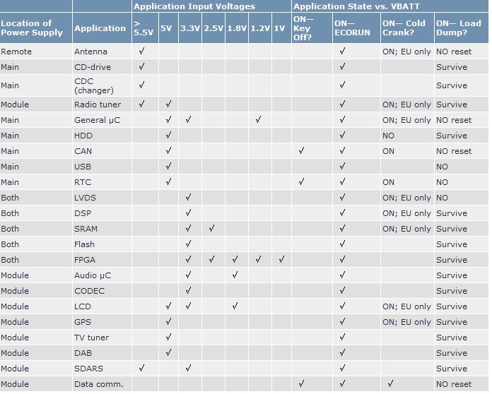 大(da)多(duo)數(shu)係(xi)統(tong)電(dian)源(yuan)的(de)基(ji)本(ben)架(jia)構(gou)選(xuan)擇(ze)應(ying)從(cong)電(dian)源(yuan)要(yao)求(qiu)以(yi)及(ji)汽(qi)車(che)廠(chang)商(shang)定(ding)義(yi)的(de)電(dian)池(chi)電(dian)壓(ya)瞬(shun)變(bian)波(bo)形(xing)入(ru)手(shou)。對(dui)於(yu)電(dian)流(liu)的(de)要(yao)求(qiu)應(ying)該(gai)反(fan)映(ying)到(dao)電(dian)路(lu)板(ban)的(de)散(san)熱(re)設(she)計(ji)。表(biao)1歸納了大多數設計的電路及電壓要求。