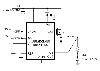 圖6.MAX1744/MAX1745為高壓(36V)、降壓型DC-DC控製器。