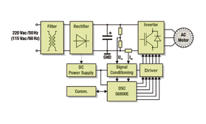 如圖1所示,完整的調速驅動係統包括EMI濾波器、輸入整流器、直流供電、DSC(數字信號控製器)、信號調理電路,供電變極器,以及門控驅動器等。