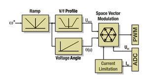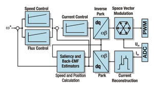 內部電流回路計算了需要產生的扭矩和磁通電流要求的定子轉向和定子電壓積分。Park(dq/aβ)單元將電壓轉換為在靜態參考結構中所需求的三相交流定子電壓。