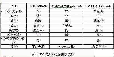 對於可滿足手機內部電源轉換需求的不同電壓穩壓器,我們必須認真考慮它們的優缺點(見表1)。目前有三種選擇:線性LDO穩壓器、無電感型開關穩壓器(亦稱為充電泵)以及傳統的開關穩壓器(基於電感器)。