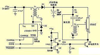 閃光電容器充電器基本上是一種具有某些特殊能力的變壓器耦合升壓轉換器。當其“充電”控製線為高電位時,穩壓器同步內部功率開關,使升壓變壓器產生高電壓脈衝。然後,這些脈衝再經整流和濾波,產生300V的直流輸出,其轉換效率高達80%。
