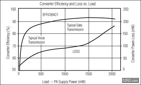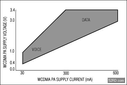 另ling外wai一yi個ge需xu要yao重zhong點dian考kao慮lv並bing關guan係xi到dao係xi統tong性xing能neng的de問wen題ti是shi,對dui於yu這zhe種zhong特te殊shu用yong途tu的de降jiang壓ya型xing開kai關guan調tiao節jie器qi,有you一yi些xie什shen麼me樣yang的de特te殊shu性xing能neng要yao求qiu。為wei了le便bian於yu理li解jie,首shou先xian應ying該gai研yan究jiu一yi下xia功gong放fang的de負fu載zai特te性xing。圖tu2由一個主要的蜂窩電話製造商提供,表示一個雙極工藝的固定增益W-CDMA功率放大器的負載曲線。在峰值發送功率時,功放需要3.4V的供電電壓,並消耗掉300mA到600mA的電流。在最低發送功率時,也就是當靠近基站並且隻發送話音時,功放僅吸取30mA的電流,電源電壓為0.4V到1V。對應的功放消耗功率分別為2040mW(最大值)和12mW(最小值)。[page]