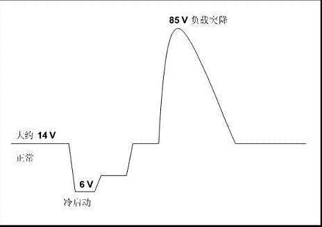 如12V電池電源線的電壓瞬變範圍(VIN)非常寬廣,小至6V,,大至87V。典型的車載電力係統的工作電壓範圍往往隻有在9V~16V。引擎關閉時電池的正常額定電壓為12V,啟動時為14.4V。但是,這個範圍在瞬變狀態時很容易擴大到80V峰值以上。