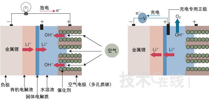 日本產綜研通過將電解液分成兩種解決了這一問題。在負極(金屬鋰)一側使用有機電解液,在正極(空氣)一側使用水性電解液。在兩種電解液之間設置隻有鋰離子穿過的固體電解質膜,將兩者隔開(圖8)。這樣便可防止電解液混合,並促進電池發生反應。