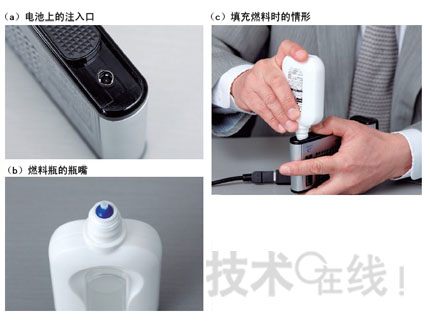 從位於底部的注入口向燃料電池填充燃料(a)。50mL裝燃料瓶由東洋製罐製造(b)。將瓶嘴插入電池的燃料注入口,隻有對準時,瓶嘴才會插入注入口裏麵注入燃料(c)。