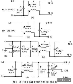 [page]xuyaozhichu,dangedingdianliujiaodashi,gongmoeliuquandexianjingyeyaoxiangyingzengda,yibiannengchengshoujiaodadedianliu。ciwai,shidangzengjiadianganliang,kegaishandipinshuaijiantexing。C1和C2采用薄膜電容器,容量範圍大致是0.01Μf~0.47μF,主要用來濾除串模幹擾。C3和C4跨接在輸出端,並將電容器的中點接地,能有效地抑製共模幹擾。C3和C4亦可並聯在輸入端,仍選用陶瓷電容,容量範圍是2200Pf~0.1μF。