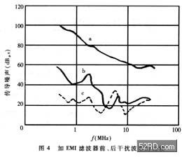 EMI濾波器能有效抑製單片開關電源的電磁幹擾。圖4中曲線a為不加EMI濾波器時開關電源上0.15MHz~30MHz傳導噪聲的波形(即電磁幹擾峰值包絡線)。曲線b是插入如圖3(d)所示EMI濾波器後的波形,能將電磁幹擾衰減50dBμV~70dBμV。顯然,這種EMI濾波器的效果更佳。[page]