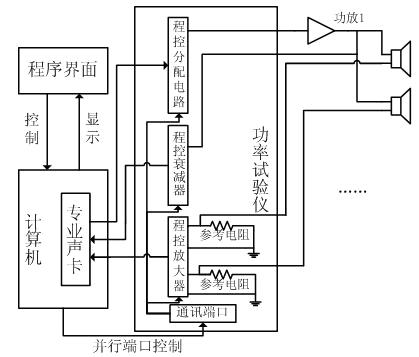 changjiandezhuanyeshengkayibanzhijubeilianggeshurutongdao,lianggeshuchutongdao,ergonglvshiyanyaoqiunenggoutongshiduiduogetongdaojinxingceshi,guxuyaofenpeidianlushixianxinhaoxuanze;此外,專業聲卡的電壓工作範圍在1至2伏(fu)之(zhi)間(jian),揚(yang)聲(sheng)器(qi)的(de)實(shi)際(ji)工(gong)作(zuo)電(dian)壓(ya)和(he)工(gong)作(zuo)電(dian)流(liu)有(you)較(jiao)大(da)的(de)變(bian)化(hua)範(fan)圍(wei),因(yin)此(ci)需(xu)要(yao)進(jin)行(xing)電(dian)平(ping)變(bian)換(huan)才(cai)能(neng)和(he)聲(sheng)卡(ka)連(lian)接(jie)。綜(zong)合(he)這(zhe)些(xie)因(yin)素(su),需(xu)要(yao)一(yi)套(tao)獨(du)立(li)的(de)功(gong)率(lv)試(shi)驗(yan)儀(yi)和(he)聲(sheng)卡(ka)相(xiang)配(pei)合(he),才(cai)能(neng)完(wan)成(cheng)測(ce)試(shi)功(gong)能(neng)。功(gong)率(lv)試(shi)驗(yan)儀(yi)內(nei)部(bu)由(you)程(cheng)控(kong)分(fen)配(pei)電(dian)路(lu)、程控衰減器、程控放大器、通訊端口、電源電路和接線端子等部分組成。整個硬件平台結構如圖1所示。