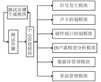 係統軟件采用模塊化設計方法,整個係統包含中心管理模塊、測試步驟生成模塊、聲卡控製模塊、信號發生模塊、揚聲器模型分析模塊、硬件端口控製模塊、數(shu)據(ju)庫(ku)管(guan)理(li)模(mo)塊(kuai)和(he)界(jie)麵(mian)管(guan)理(li)模(mo)塊(kuai)等(deng)等(deng)。其(qi)中(zhong)中(zhong)心(xin)管(guan)理(li)模(mo)塊(kuai)為(wei)核(he)心(xin)部(bu)分(fen),軟(ruan)件(jian)運(yun)行(xing)時(shi)從(cong)該(gai)模(mo)塊(kuai)進(jin)入(ru),其(qi)它(ta)功(gong)能(neng)模(mo)塊(kuai)均(jun)在(zai)該(gai)模(mo)塊(kuai)的(de)管(guan)理(li)下(xia),協(xie)調(tiao)一(yi)致(zhi)的(de)工(gong)作(zuo)。各(ge)功(gong)能(neng)模(mo)塊(kuai)均(jun)有(you)標(biao)準(zhun)的(de)數(shu)據(ju)接(jie)口(kou),統(tong)一(yi)經(jing)過(guo)中(zhong)心(xin)控(kong)製(zhi)模(mo)塊(kuai)完(wan)成(cheng)數(shu)據(ju)交(jiao)換(huan),彼(bi)此(ci)之(zhi)間(jian)不(bu)獨(du)自(zi)發(fa)生(sheng)聯(lian)係(xi),因(yin)此(ci)可(ke)以(yi)保(bao)證(zheng)模(mo)塊(kuai)的(de)獨(du)立(li)性(xing),為(wei)程(cheng)序(xu)的(de)維(wei)護(hu)和(he)升(sheng)級(ji)建(jian)立(li)了(le)良(liang)好(hao)基(ji)礎(chu)。各(ge)個(ge)模(mo)塊(kuai)完(wan)成(cheng)的(de)功(gong)能(neng)如(ru)下(xia)所(suo)述(shu):