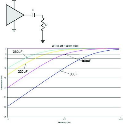 該隔直電容會和耳機阻抗形成一個高通濾波器,理想條件下該高通濾波器的3dB低頻截止頻率為1/2πRC(R為耳機的阻抗,C為隔直電容的容值)。為wei了le改gai善shan耳er機ji低di頻pin音yin效xiao,我wo們men希xi望wang此ci高gao通tong濾lv波bo器qi的de低di頻pin截jie止zhi頻pin率lv越yue低di越yue好hao,但dan由you於yu耳er機ji的de阻zu抗kang是shi固gu定ding的de,為wei獲huo得de更geng好hao低di頻pin響xiang應ying唯wei一yi可ke以yi改gai變bian的de就jiu是shi電dian容rong容rong值zhi,所suo以yi一yi般ban用yong於yu耳er機ji輸shu出chu的de隔ge直zhi電dian容rong容rong值zhi都dou很hen大da,圖tu1所示為選擇不同容值的隔直電容時形成的高通濾波器頻響曲線。