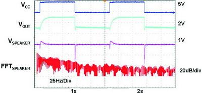 圖2耳機驅動器上電和斷電時耳機上測到的電壓波形和頻譜