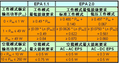 表1:美國環保署“能源之星”外部電源的1.1及2.0版規範。
