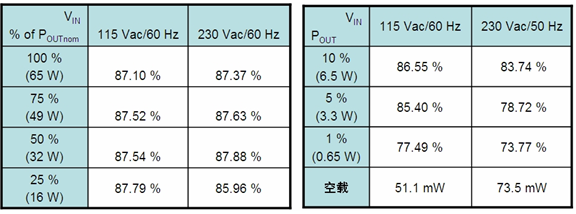 表2:基於NCP1237的65 W筆記本適配器工作能效及待機能耗測試結果。