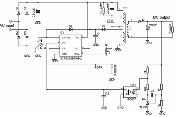這係列控製器還采用輕載時頻率反走技術和跳周期模式,降低輕載時的開關頻率,從而提升能效;同時,開關頻率在25 kHz時鉗位,從而消除可聽噪聲。此外,這係列器件提供多種保護特性,如雙啟動電流電平、輸入欠壓及主電源過壓保護、過載保護、雙過渡保護閾值、軟啟動和閂鎖保護等。這係列器件還提供可選的動態自供電(DSS)功能,從而無需輔助繞組; 並內置斜坡補償,不需要外部設定。以NCP1238為例,這器件的典型應用電路圖如圖2所示。