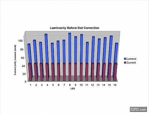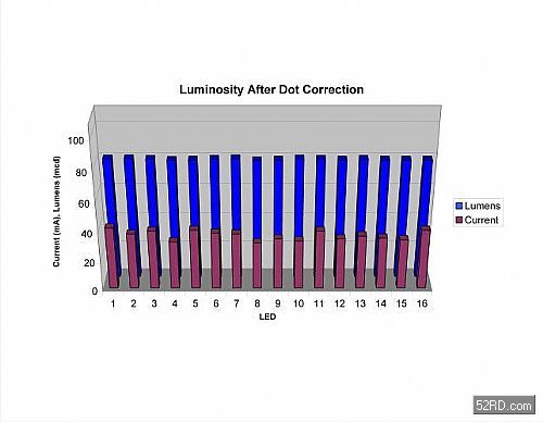 為了提供像點修正功能,製造商會透過畫麵擷取測量每顆LED的亮度,再將係統最暗的LED指定為基準LED,然後將其它像素的亮度調整成和基準LED相同;調整方式則是根據LED輸出亮度將每個像素的電流減少一定比例。德州儀器(TI)的TLC5940或其它類似元件都會將每顆LED的像點修正值儲存在晶片內建的EEPROMjiyiti,huoshizaimeigegengxin週qidangzhongzuodongtaixiugai。zhezhongshuangzhongxiangdianxiuzhengfangshihenyoudanxing,tajinengzaiwaijiezhaomingtiaojiangaibianshigengxinzhenggemianbandeliangdu,younengtigongchangqibaocunxiangdianxiuzhengzixunyiquebaomianbanliangdujunyun。zhiyaoxiangsuliangdusuishijianchuxianbianhua,huoshimianbanyinweiguzhangerxuyaotiaozhenghegenghuan,gongchengrenyuansuishidounenggengxinEEPROM資料。我們將用下列例子來說明這種做法。