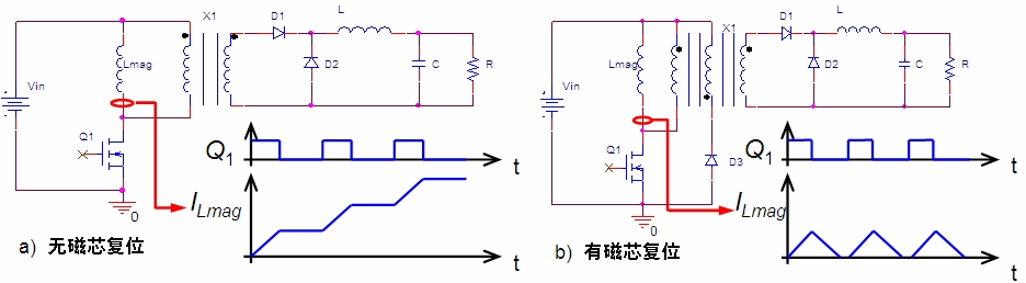 正zheng激ji轉zhuan換huan器qi中zhong,變bian壓ya器qi的de磁ci芯xin單dan方fang向xiang磁ci化hua,在zai每mei個ge開kai關guan周zhou期qi都dou需xu要yao采cai用yong相xiang應ying的de措cuo施shi來lai使shi磁ci芯xin複fu位wei到dao初chu始shi值zhi,否fou則ze勵li磁ci電dian流liu會hui在zai每mei個ge開kai關guan周zhou期qi增zeng大da,經jing曆li幾ji個ge周zhou期qi後hou會hui使shi磁ci芯xin飽bao和he,損sun壞huai開kai關guan器qi件jian。相xiang對dui而er言yan,如ru果guo有you磁ci芯xin複fu位wei,電dian流liu就jiu不bu會hui在zai每mei個ge開kai關guan周zhou期qi增zeng大da,電dian壓ya會hui基ji於yu勵li磁ci電dian感gan(Lmag)反相並使磁芯複位。圖1以單開關正激轉換器為例,簡要對比了無磁芯複位與有磁芯複位的電路圖及勵磁電感電流波形。