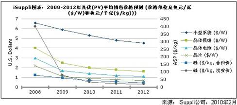 2010年將保持這種趨勢,盡管價格下跌速度可能減慢。晶體組件價格將下降20%,晶片價格將下滑18.2%,多晶矽將下跌56.3%。