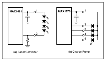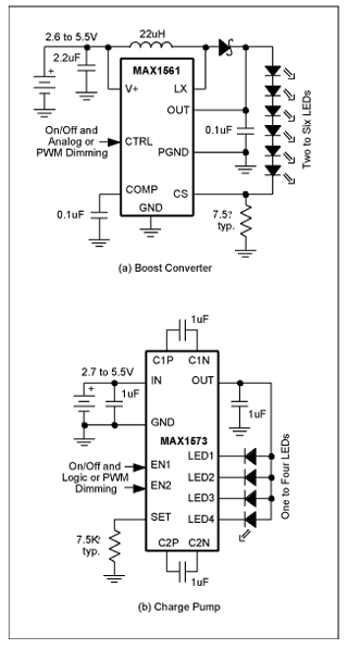 圖1.MAX1561升壓轉換器(a)和MAX1573電荷泵(b)是2種LED供電方案。電路複雜度基本相同,但電荷泵不需要電感。