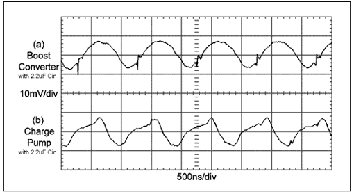 圖5.如果開關頻率為1MHz,驅動同樣數量的LED,采用相同的輸入電容,那麼電荷泵(b)和升壓轉換器(a)的輸入紋波基本相同。然而,由於電荷泵與LED之間有較多引線,建議使用更短的連線(天線),另外,泵電容產生的EMI低於升壓轉換器的電感。