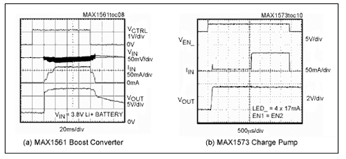 圖6.MAX1561升壓轉換器(a)和MAX1573電荷泵(b)的軟啟動和關斷波形都表明沒有輸入過衝電流(IIN),使電池跌落最小,以免對係統的其它電路造成影響。
