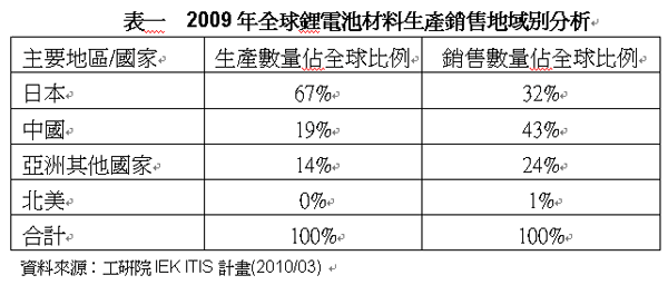 在生產與銷售地區上,在2009年nian仍reng然ran呈cheng現xian集ji中zhong於yu亞ya洲zhou的de態tai勢shi,其qi中zhong日ri本ben仍reng為wei最zui主zhu要yao的de正zheng極ji材cai料liao生sheng產chan與yu銷xiao售shou大da國guo,雖sui然ran在zai日ri本ben國guo內nei因yin生sheng產chan成cheng本ben高gao漲zhang之zhi故gu,鋰li電dian池chi的de製zhi造zao出chu口kou逐zhu年nian下xia降jiang中zhong,但dan至zhi今jin全quan球qiu仍reng有you近jin67%的鋰電池正極材料在日本生產,中國與其他亞洲地區僅占19%與14%。至於在銷售地區分布上,由於下遊的電池大廠仍以日商為多,因此日本仍為銷售地區比例最高的國家,其他依序為中國、其他亞洲地區、北美等地。