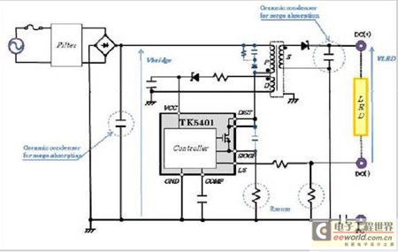 創意電子新近推出的TK5401就是這樣一款LED驅動電源IC,它具有不需要DC電源特性中所必須的電解電容的特性,使得LED壽命高達4萬小時以上。據介紹,TK5401封裝內置了高電壓功率MOS管及控製電路,因去除電解電容實現了小型化、低成本,並且實現了LED燈的長壽命和高效能。