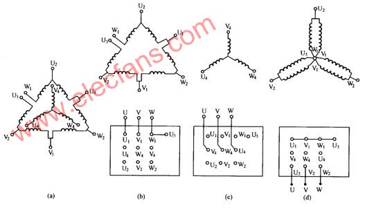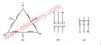 其中,(a)圖為結構示意圖,改變接線方法可獲得兩種接法,(b)圖為三角形接法,磁極對數為2對極,同步轉速為1500r/min,是一種低速接法;(c)圖為雙星形接法,磁極對數為1對極,同步轉速為3000r/min,是一種高速接法。