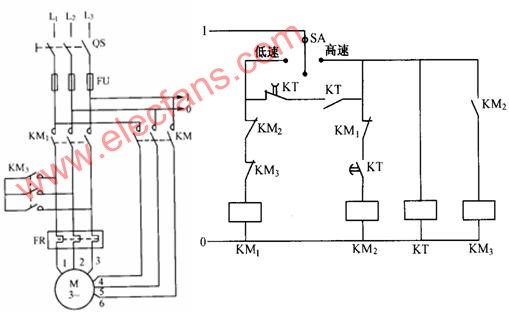 轉換開關SA置於高速位置,KT得電,其瞬時觸點閉合,KM1得電,M低速運行,當時間繼電器的設定時間到達,KM1失電,KM2、KM3得電,電動機M高速運行。