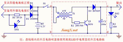 太陽能供電板的電路如圖1所示。由D1、BT構成係統的太陽能充電電路。平時,隻要達到一定光強,太陽能電池板便通過二極管D1為充電電池BT充電,直至飽和。除了太陽能充電方式外,我還設計了備用的外部直流電源充電接口以防不時之需。外部充電電路由R1、DS1、D2、BT構成,R1選用功率為1W的電阻,當R1為10歐姆的時候,最佳外部充電電壓為3-4伏,DS1為外部充電指示燈,它是利用電阻R1上的壓降來點亮的。後麵的升壓電路是運用間歇振蕩器的快速關斷(截止)的特性而實現升壓的。S1為供電開關,當S1閉合後升壓電路開始工作,太陽能供電板便可驅動負載,J1為輸出接口,DS2是輸出指示燈。