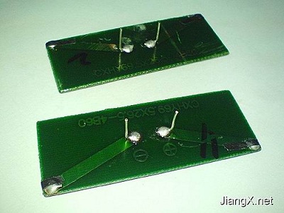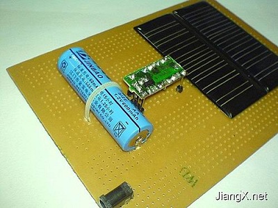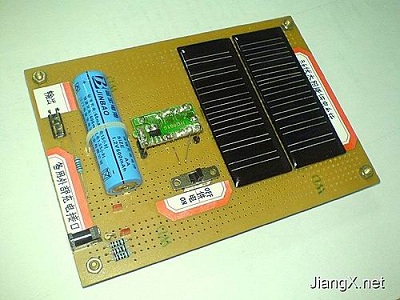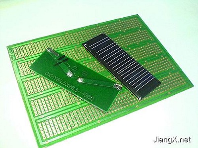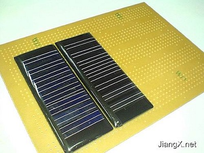 首先剪一小段金屬絲焊接在太陽能電池板的兩個電極上作為引腳(圖3),以便於連接和固定在電路板上。兩塊太陽能電池板是正極對正極,負極對負極(上麵有標識)並聯起來使用的,這樣可以有效地增強太陽能電池板提供電流的能力。安裝好太陽能電池板後如圖4所示。